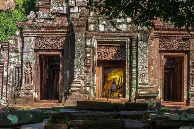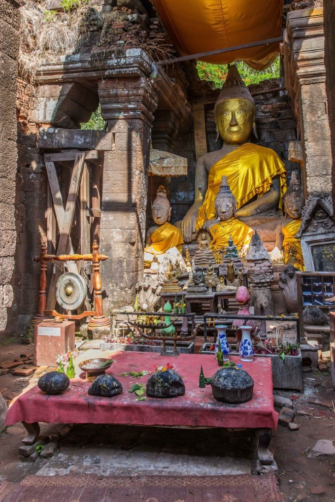 ワット・プーの最上階には、シヴァ神を象徴するリンガが祀られています。山から流れ出る泉の水はこのリンガを清め続けており、この水は聖水として信仰の対象となっています。現在ではリンガの代わりに仏像が祀られていますが、古代から続くこの儀式は今なお大切に守られています。