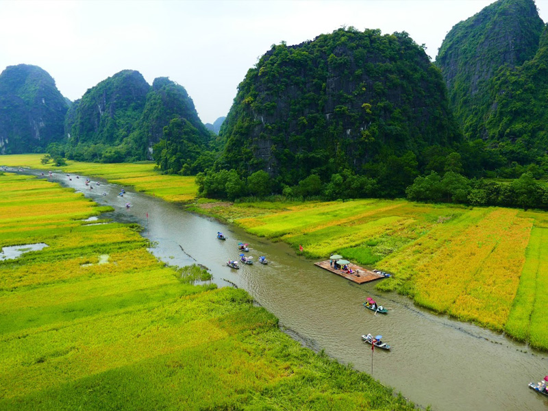 Bookingによると、ニンビンは川と連なる山々が織りなす絵のような美しい風景で知られています。秋に訪れると、旅行者はトレッキングやサイクリングを通じて、村の道を進みながら黄金色の稲穂を楽しむことができます。ハンムアの頂上に登れば、下に広がるチャンアンの景観や、広大な稲田、石灰岩の山々を一望できます。