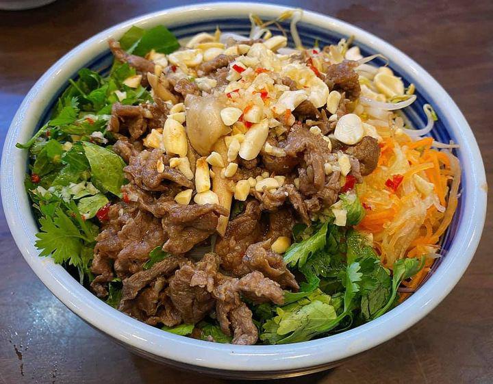 ブンボー南部は、実際にはハノイで起源を持ち、広く普及しています。このブンはとてもさっぱりしており、材料がこってりせず、様々な成分がそのまま残っています。柔らかい牛肉のスライスが、カリッとしたピーナッツやもやしと融合し、香草、カリカリの玉ねぎ、少しの魚醤と辛い唐辛子の風味が調和しています。