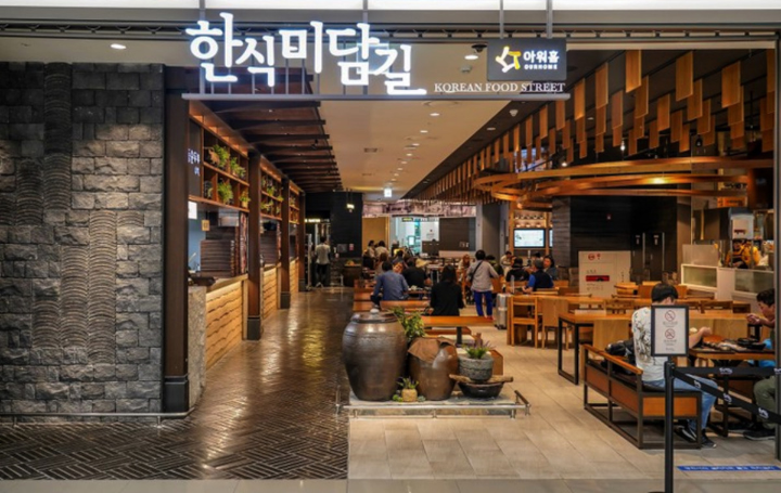 韓国の美食と文化を愛する旅行者は、ターミナル1の「韓国文化の通り」を見逃せません。4階の中心に位置するこのエリアは、伝統的な韓国の家屋を模したデザインで、瓦屋根と望楼があり、リラックスできる空間とターミナル全体のパノラマビューを提供します。ここにあるハンスキ・ミダムギルのフードコートは、豪華で快適な空間で、最も有名で人気のある韓国の飲食ブランドが集まっています。