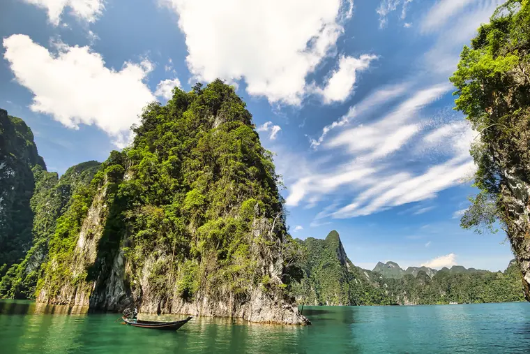 カオソック国立公園はタイ南部に位置し、1980年に設立された美しい自然の宝庫です。この公園の熱帯雨林は、アマゾンよりも豊かな生物多様性を誇り、様々な動植物が生息しています。公園内には美しい滝が点在し、清らかな水が流れ落ちる光景は訪れる人々を魅了します。また、壮大な石灰岩の断崖が特徴で、ユニークな地形が広がっています。これにより、ハイキングやバードウォッチングなどのアクティビティが楽しめ、自然愛好家にとって理想的な場所となっています。