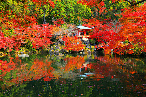 醍醐寺は平安時代の874年に創建され、京都で最も重要な寺院の一つです。五重塔は高さ57mで、京都を象徴する建物の一つです。紅葉が五重塔と共に映る様子は、まさに秋の京都の象徴と言えます。
