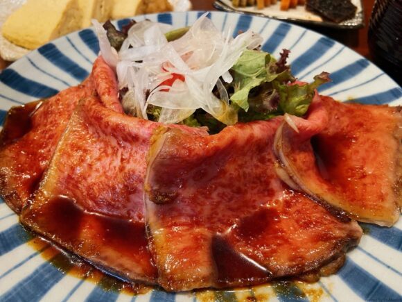 ハノイガーデンでのおすすめ料理は、竹で包んでローストされたローストビーフ。竹の香りがほんのりとお肉に移り、ジューシーで柔らかい食感が楽しめます。お皿にはレタスが敷かれ、その上にゴマがふりかけられており、見た目も非常に美しいです。