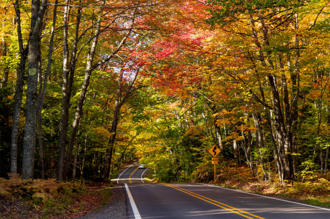 ミシガン州北部に位置するキウィナウ半島は、秋に訪れるべき絶好の場所の一つです。特に、ブロックウェイ・マウンテン・ドライブは、美しい紅葉を一望できる素晴らしいドライブルートとして知られています。石造りの壁に囲まれた道を進むと、道の両側には色鮮やかな木々がトンネルのように広がっています。まるで自然が作り出したアーチをくぐり抜けるような感覚です。