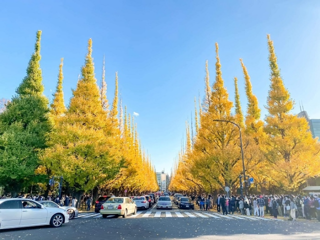 秋の明治神宮外苑は、何千本もの銀杏の木々に覆われます。その黄金色に輝く葉は、公園全体を美しい景観に変え、訪れる人々を魅了します。石畳の小道には落ち葉が敷き詰められ、まるで光り輝く絨毯の上を歩いているかのような特別な感覚を楽しむことができます。訪れる観光客は、カメラを片手にこの絶景を写真に収める姿が多く見られます。