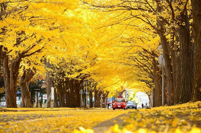 黄金の絨毯が広がる銀杏並木