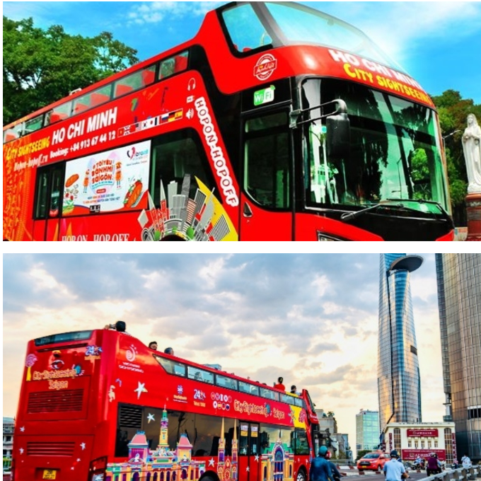 ホーチミン市中心部では、オープントップの二階建て観光バスが運行しています。バスには以下のサービスが備わっています: