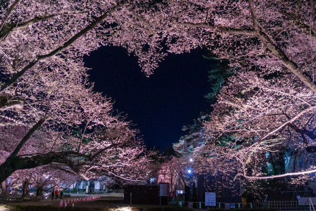 メイン会場となる弘前公園には、約2,600本の桜が50種類以上植えられています。公園内では桜と弘前城がライトアップされ、昼間とは異なる幻想的な風景を楽しめます。特に、お堀に沿って咲き誇る桜並木や、散った花びらが水面を埋め尽くす「花筏(はないかだ)」の風景は必見です。