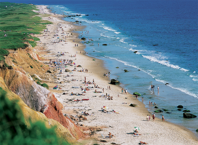 このビーチは、1799年に建てられた歴史的なGay Head灯台がそびえる岬に沿って、なだらかなカーブを描く長い砂浜が広がっています。また、背後には赤茶色の砂岩の崖がそびえ立ち、その景観は1966年にアメリカの国家自然記念物として指定されました。