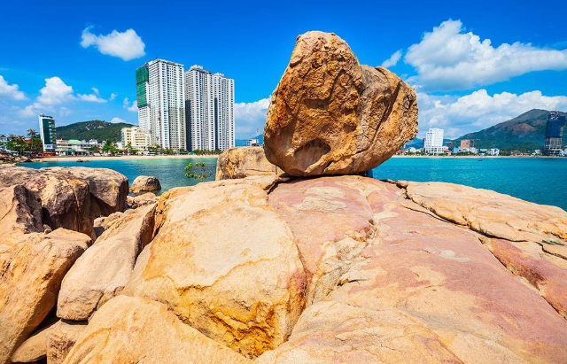 ホン・チョン(Hòn Chồng)は、ニャチャン市街地から北東へ約3km、ファム・ヴァン・ドン通り沿いに位置する、自然が織りなす独特な景観が魅力のスポットです。海に向かって不思議なバランスで重なり合った巨大な岩々が連なり、その雄大な姿は訪れる人々の目を引きます。