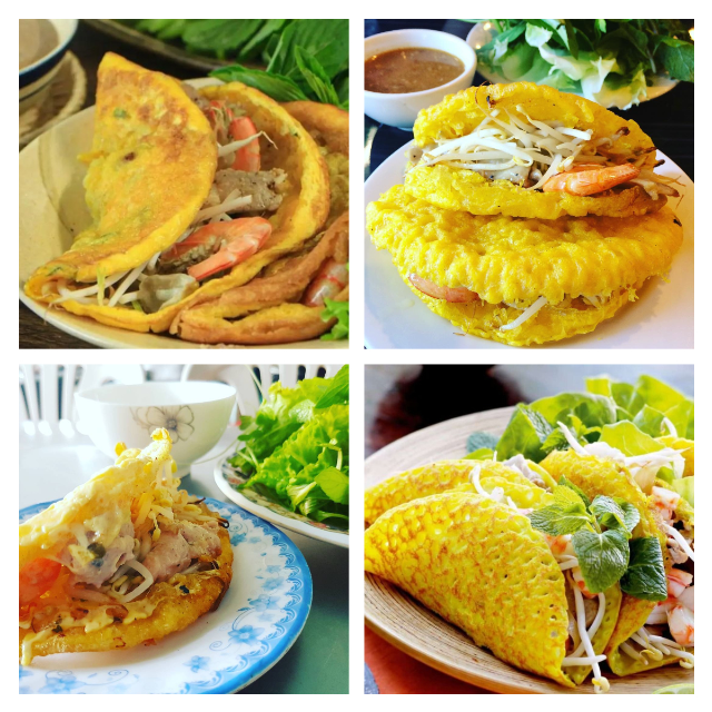 食べ方は、ライスペーパーでバイン・コアイと野菜を巻いて、甘酸っぱい魚醤ダレ(ヌクチャム)にディップするのが定番。食べ応えも抜群で、観光客に大人気の一品です。