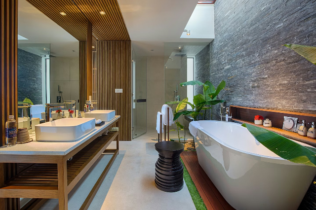 客室はすべてプライベートヴィラ仕様で、専用プールと中庭を完備。最小でも約50㎡以上の広さがあり、ゆとりある空間で静かに過ごせます。上質で落ち着いたインテリアに加え、開放感のあるバスルームにはレインシャワーも備えられ、心身ともにリラックスできる環境が整っています。